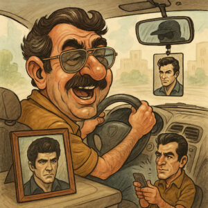 اتومبیلش موزۀ شخصیِ این عشق بود. روی داشبورد، عکسی قاب شدهای از “بهروز وثوقیِ ” جوان بود که با نگاهی نافذ به رانندگی او نظاره میکرد. از آینهٔ وسط، “محمدعلی فردین” در حالتی قهرمانانه آویزان بود. برایم تعریف کرد که روزی، مسافری سوار ماشینش شده با عینک دودی و کلاهی که نیمی از صورتش را پنهان کرده بوده. و در صندلی عقب مشغول ارسال پیامک بوده. میگفت: «از آینهٔ عقب چشمم به چشمِ مسافر افتاد. چیزی در آن نگاه برایم آشنا بود.
