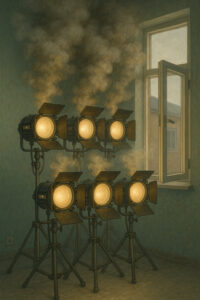 بسم الله گفتیم و کار در یکی از اتاقها شروع شد. چراغهای نویِ خریداری شده را افتتاح کردیم. هنوز یک دقیقه نگذشته بود که بوی رنگِ سوخته به مشام رسید. دود ناشی از سوختن رنگ، مزاحم کارمان شد. چند نفری نشستیم فکرهایمان رو روی هم گذاشتیم، همفکری کردیم و به این نتیجه رسیدیم که تا این رنگ، کامل نسوزد، آش همین آش است کاسه همین کاسه! پس باید همهٔ چراغها را با هم به مدت یک ربع یا بیست دقیقه روشن بگذاریم تا در ابتدای کار، رنگها حرارت ببینند و اگر قرار است بسوزند و دود کنند همین یک بار باشد و بعد در طول فیلمبرداری این مشکل را نداشته باشیم. جستجو کردیم ببینیم در فضای بازِ بیرون ساختمان پریز برق هست یا نه؟ نبود.