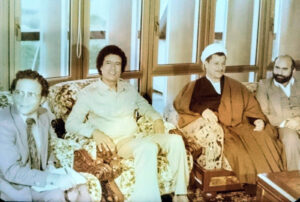 از راست: دکتر هادی سفیر ایران در لیبی – هاشمی – قذافی- سعد مجبر سفیر لیبی در ایران