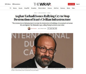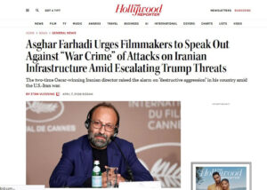 مجله «هالیوود ریپورتر» هم نوشت: اصغر فرهادی از فیلمسازان جهان خواسته تا در بحبوحه تشدید تهدیدهای ترامپ، علیه «جنایت جنگی» حملات به زیرساخت‌های ایران، موضع بگیرند. این درخواست پس از آن صادر شده که «دونالد ترامپ» رئیس‌جمهور آمریکا، تهدید کرد در صورت عدم دستیابی به توافق آتش‌بس قبل از مهلت مقرر، «کل تمدن» در ایران، از جمله زیرساخت‌های غیرنظامی را نابود خواهد کرد. «اصغر فرهادی» کارگردان ایرانی برنده دو جایزه اسکار بهترین فیلم خارجی‌زبان برای فیلم‌های «جدایی نادر از سیمین» و «فروشنده» از فیلمسازان جهانی خواسته است تا علیه “تخریب زیرساخت‌های غیرنظامی در این کشور” موضع بگیرند.