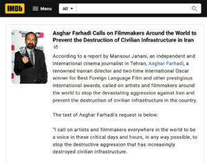 مجله معتبر «اسکرین ‌دیلی» هم نوشت: «اصغر فرهادی» کارگردان ایرانی، پس از تهدیدهای «دونالد ترامپ» رئیس‌جمهور آمریکا مبنی بر تشدید درگیری، از فیلمسازان جهان خواست تا علیه حملات آمریکا به ایران موضع بگیرند. سایت معتبر سینمایی «دِدلاین» هم نوشت: «اصغر فرهادی» کارگردان پیشکسوت ایرانی، از دیگر فیلمسازان و هنرمندان سراسر جهان خواسته است تا علناً در مخالفت با آنچه او «تجاوز مخرب» جنگ فعلی ایالات متحده علیه ایران توصیف کرد، صحبت کنند. در ادامه گزارش این مجله سینمایی که در شهر لس‌آنجلس منتشر می‌شود، آمده است: «اصغر فرهادی» عصر روز سه‌شنبه بیانیه‌ای منتشر کرد و از همکاران فیلمساز خود در سراسر جهان خواست تا در این باره موضع بگیرند.