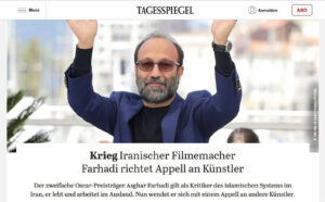 سایتِ اتریشیِ Sazbourger Nachrichten وتلویزیون سوئیس Swiss info و روزنامه «کلاین سایتونگ» و روزنامه «فاز» فرانکفورت در آلمان هم این پیام را منتشر کرده اند. روزنامه «شمال» EL NORTE مکزیک هم در ادامه پیام فرهادی نوشته: «آنتونیو گوترش» دبیرکل سازمان ملل متحد، هشدار داد که حمله به زیرساخت‌های غیرنظامی طبق قوانین بین‌المللی ممنوع است و نگرانی جهانی را در مورد تشدید احتمالی بحران افزایش می‌دهد. جدا از سایت خبری «نوز» در آلمان، مجله هنری «روبیک» اسپانیا، در خبری اعلام کرد: «این کارگردان در طول ماجراجویی‌هایش در اروپا، بیش از علاقه‌اش به فرانسه، باید به ارتباطش با اسپانیا اشاره کرد. در سال ۲۰۱۸، این کارگردان فیلم «همه می‌دانند» را کارگردانی کرد، فیلمی که کاملاً در اسپانیا و در این کشور ساخته شده و «خاویر باردم»، «پنه‌لوپه کروز»، «ریکاردو دارین» و «باربارا لنی» در آن بازی کرده‌اند.