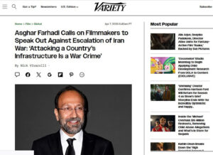 مجله‌ی معتبر «ورایتی» Variety نوشت: «اصغر فرهادی» کارگردان سرشناس ایرانی برنده دو جایزه اسکار بهترین فیلم خارجی‌‌زبان، از هنرمندان و فیلمسازان سراسر جهان خواست تا علیه بمباران ایران توسط آمریکا و اسرائیل اعتراض کنند تا «از تخریب زیرساخت‌های غیرنظامی در این کشور، جلوگیری شود». در این گزارش آمده است: فیلم جدید فرهادی با عنوان «قصه‌های موازی» که داستانش در پاریس می‌گذرد، با حضور بازیگران درجه یک فرانسوی از جمله؛ «ایزابل هوپر»، «ونسان کسل» و «کاترین دنوو» در ماه مه در جشنواره بین‌المللی فیلم «کن» اکران می‌شود.